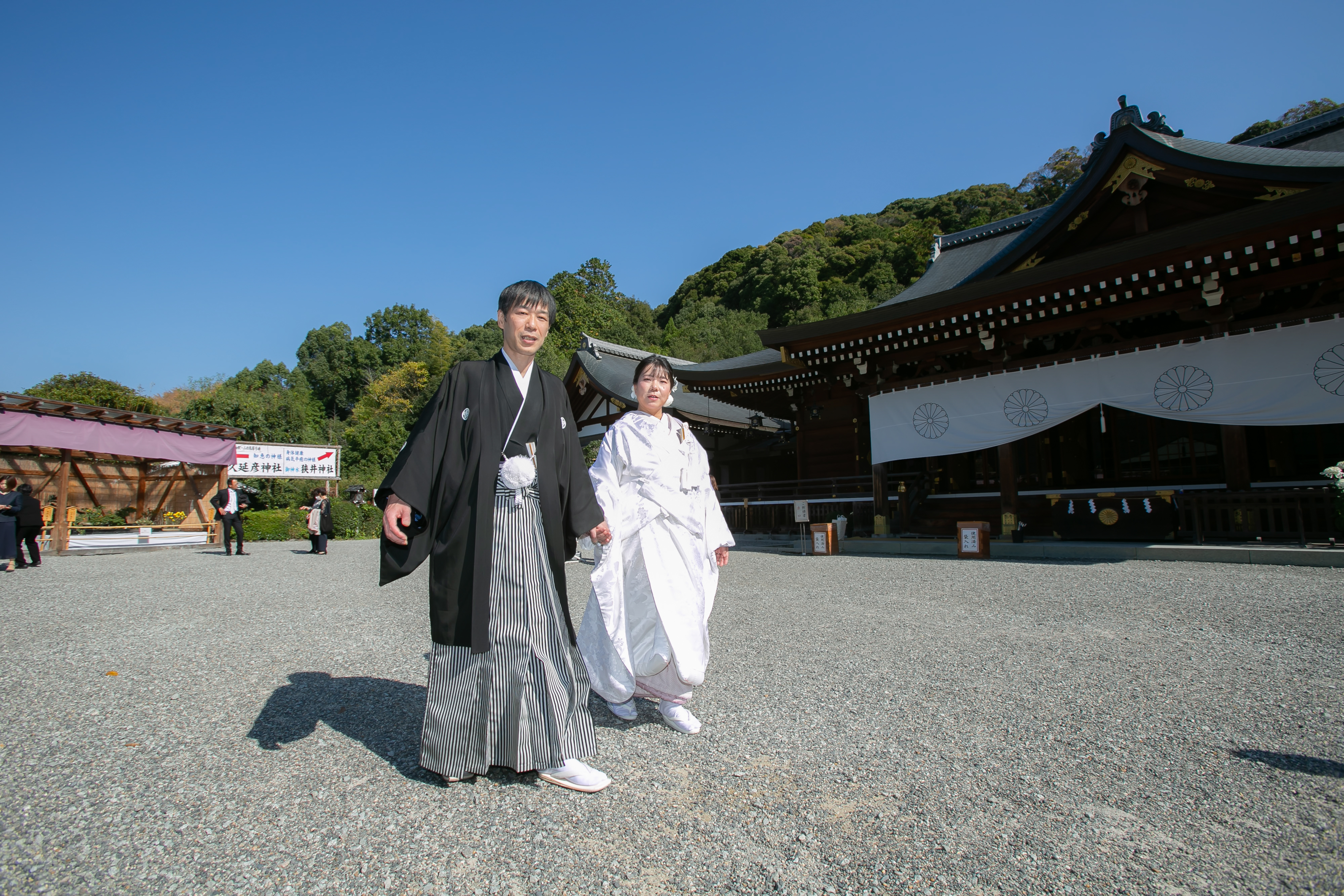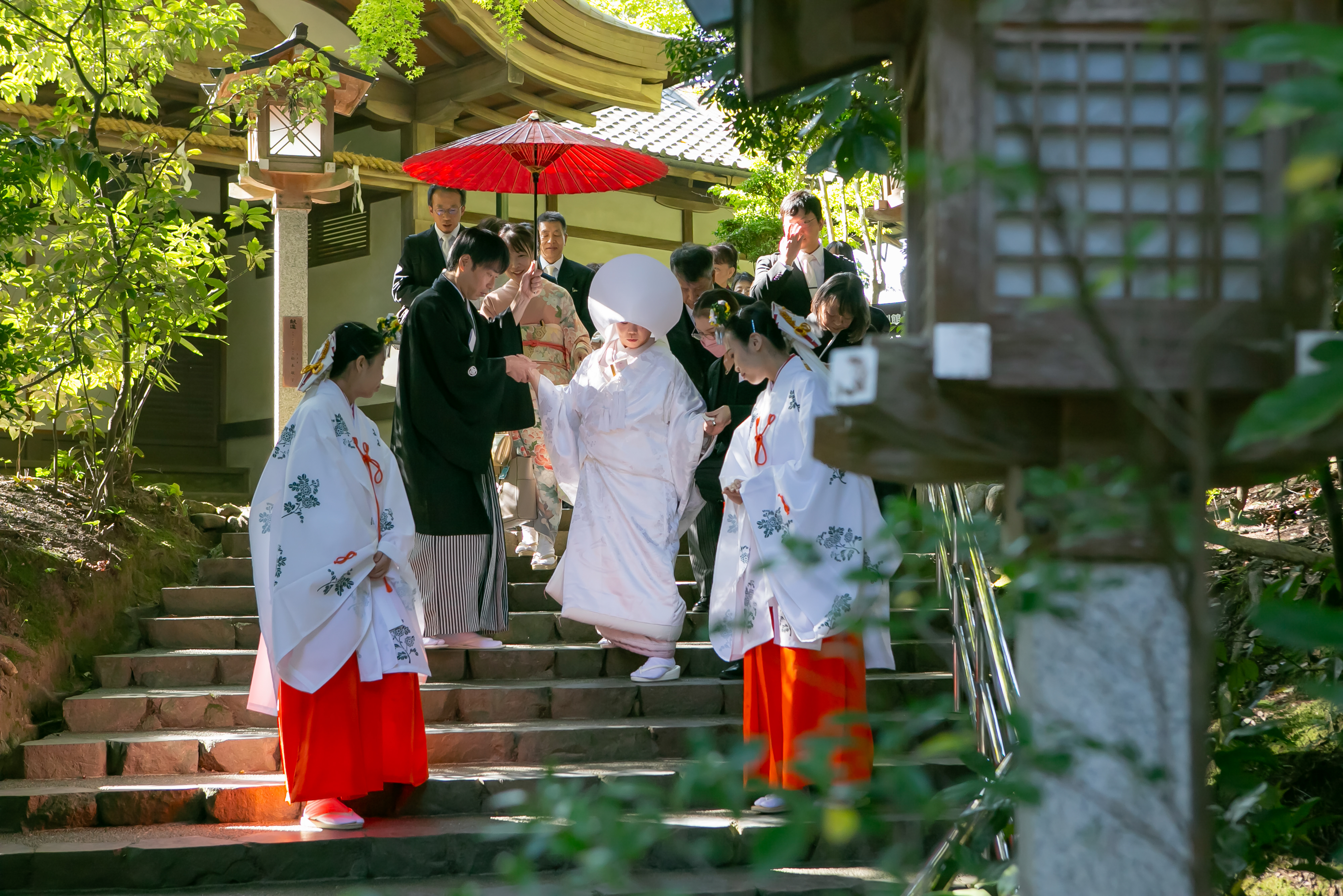 大神神社で参進される際、階段が多くその都度ご新婦様を気遣うご新郎様、微笑ましいお二人の姿をしっかりとカメラがとらえていました☺