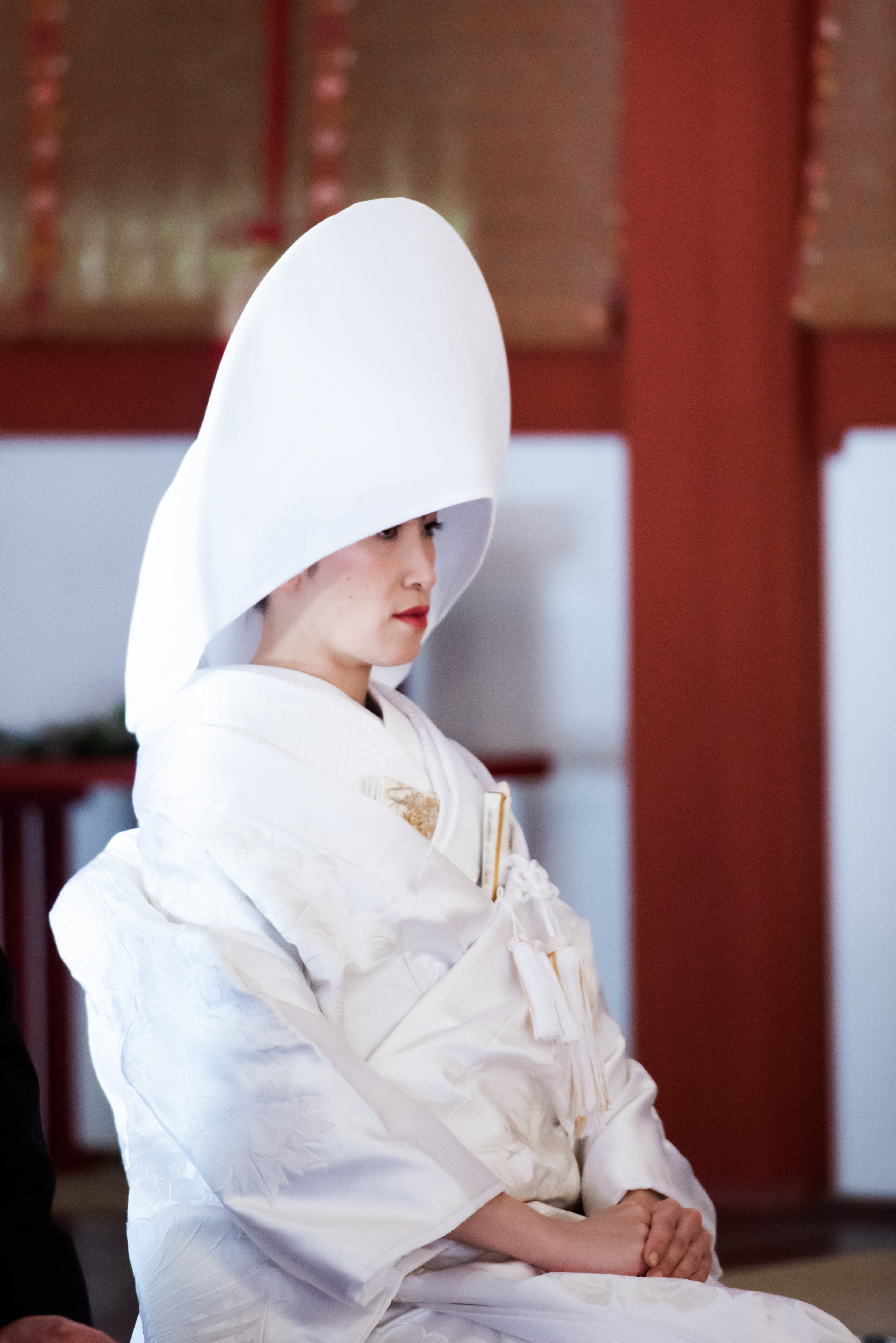 厳かなお式では白打掛を、挙式後はご自前の色打掛にお色直し。